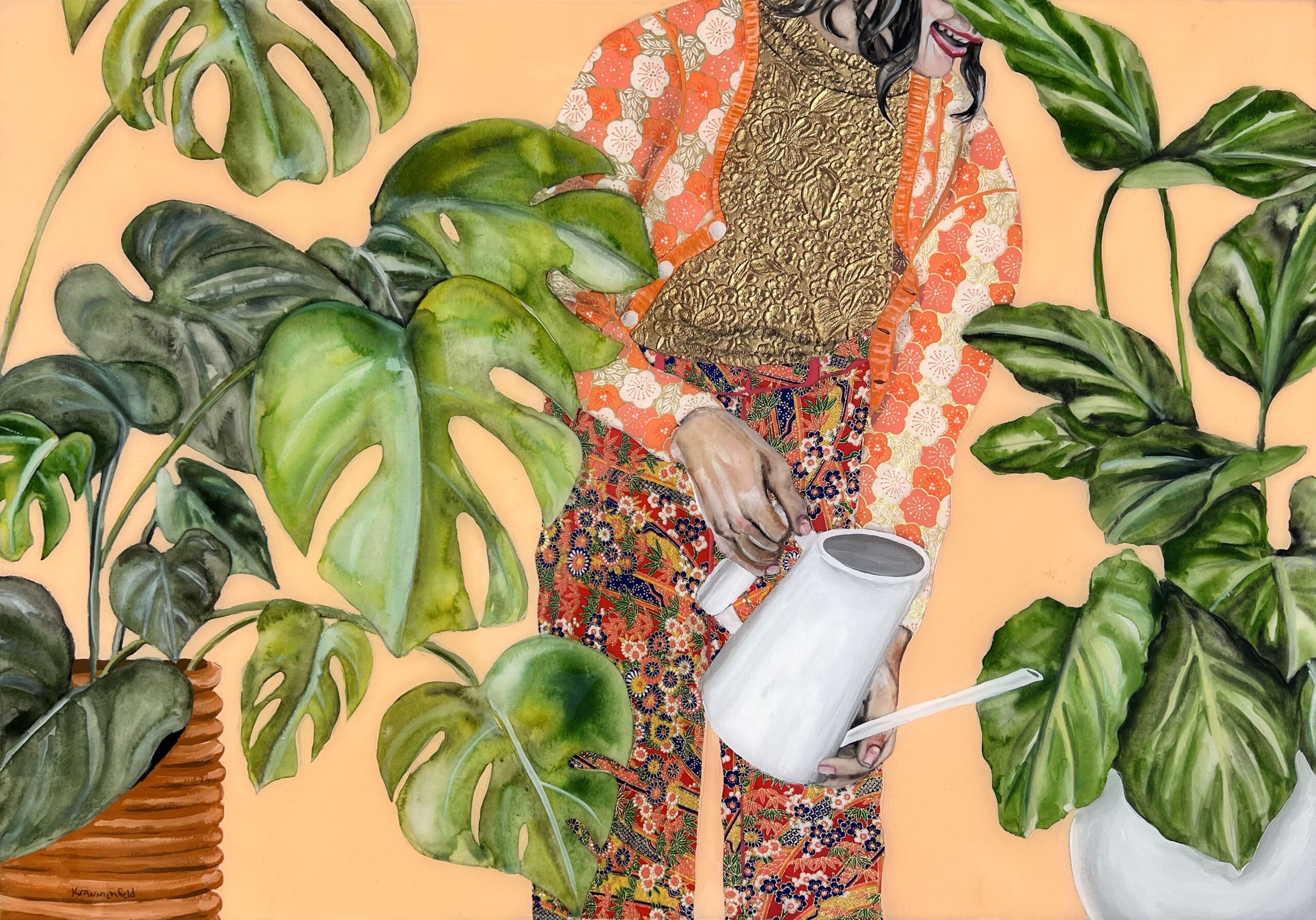 Chinese ink, watercolor, acrylic, paper collage, and resin on paper mounted on panel