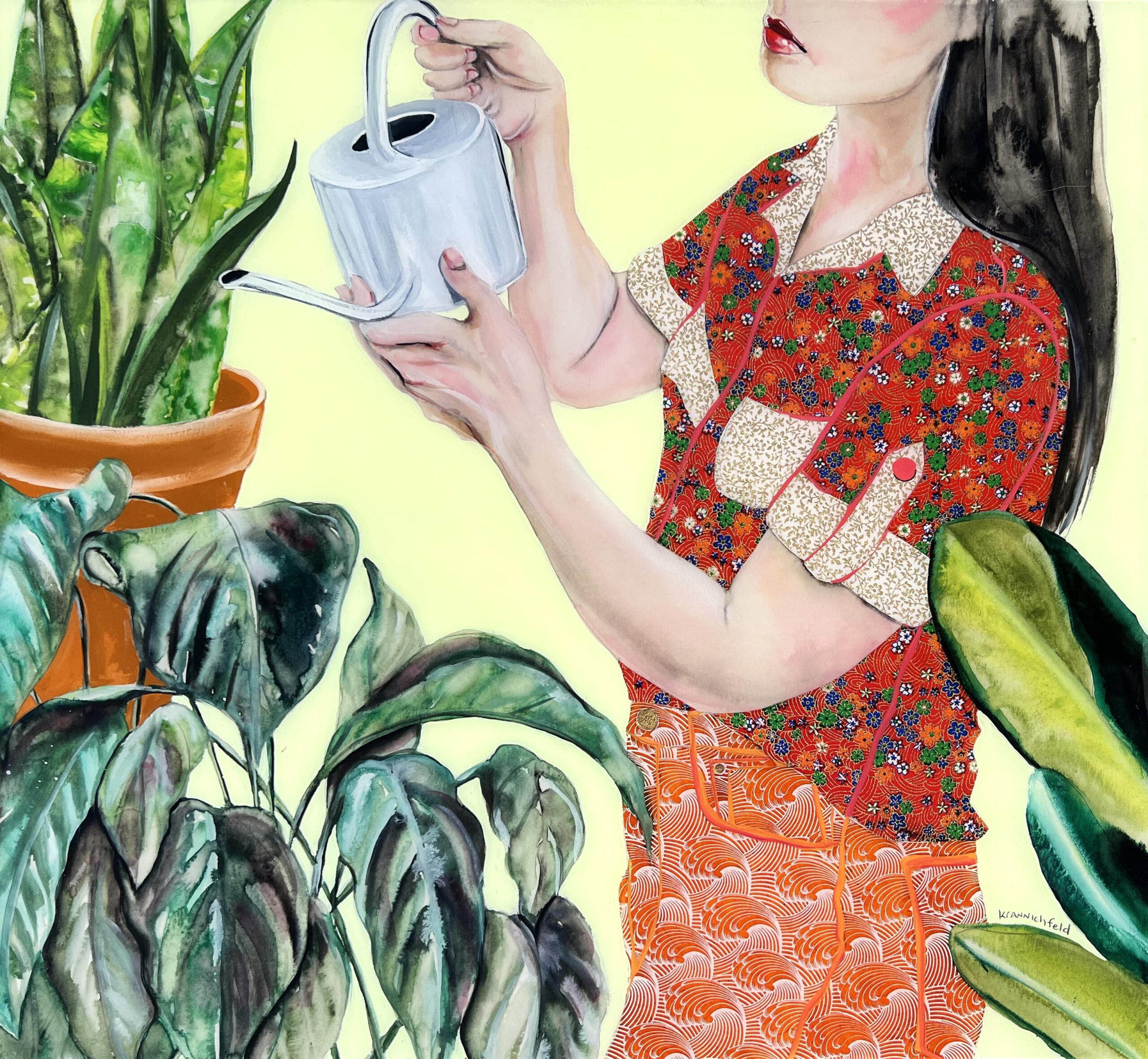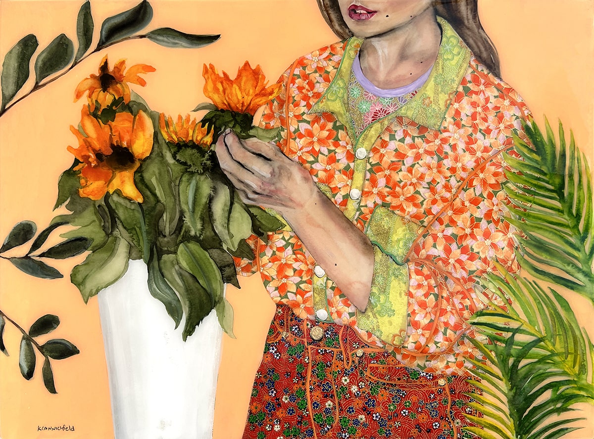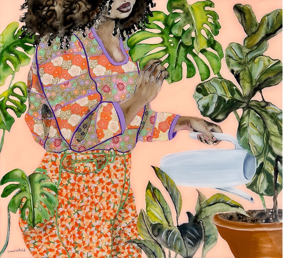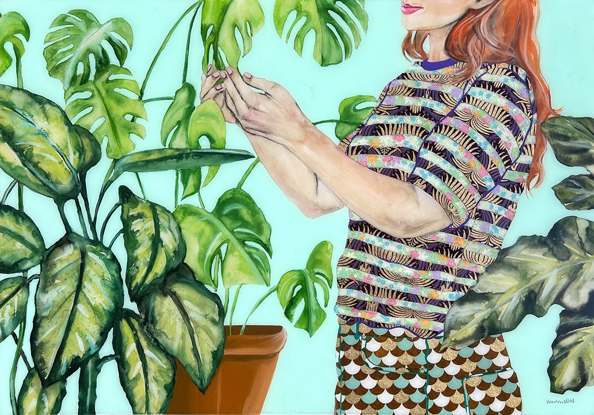 My intention in creating these pieces is to pay tribute to the many women I know who are nourishers – women who give so much of themselves to their families, friends, and communities. They often serve as the steady presence in our lives and the resilient root systems that anchor and connect us to others. The lush greenery weaving in and out of the compositions and covering parts of the figures serves as a metaphor for all the growth and connection that sprout from the self-sacrifice of these women.